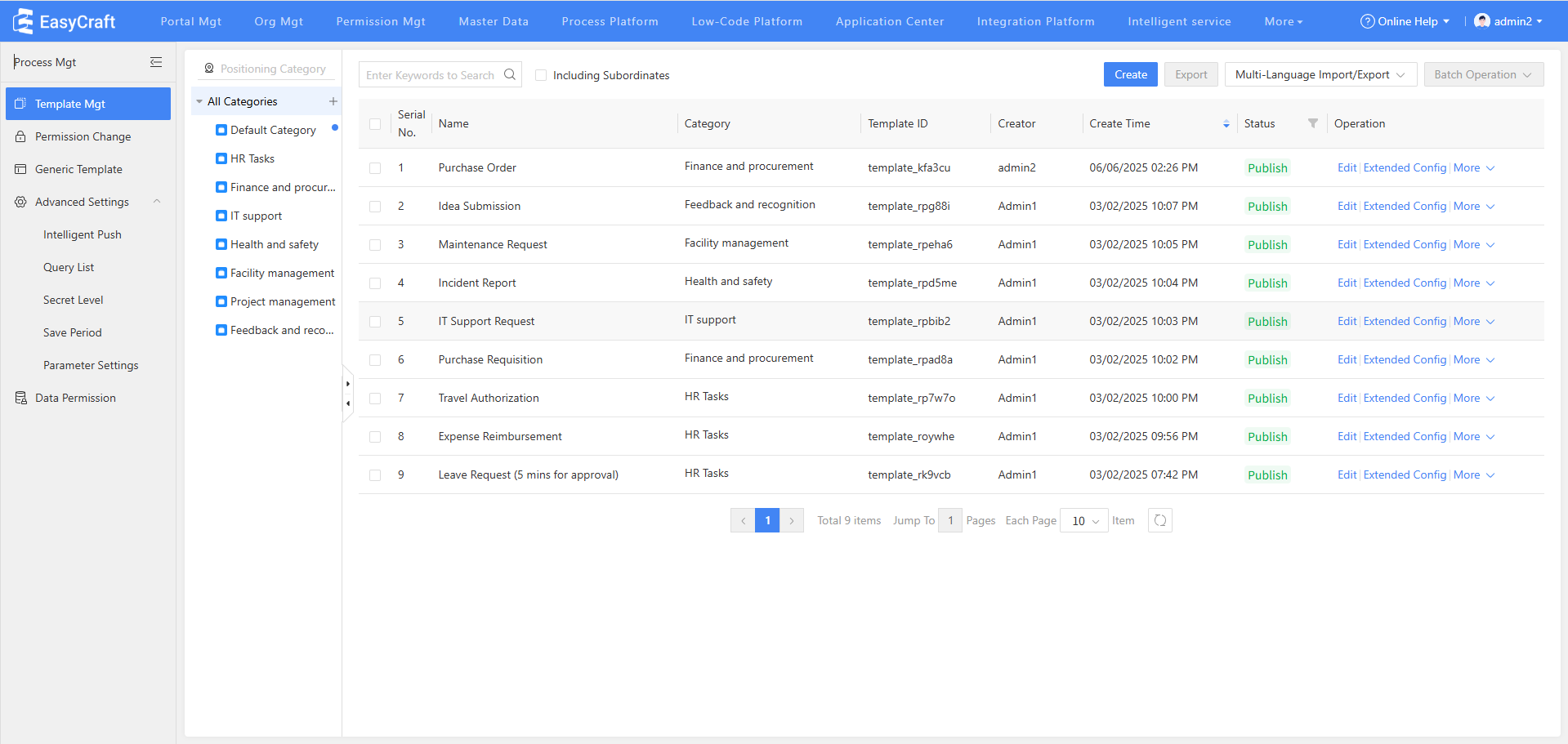 • Main content area displays the Process Template List, and provides template management functions like search, create, import/export, delete.
