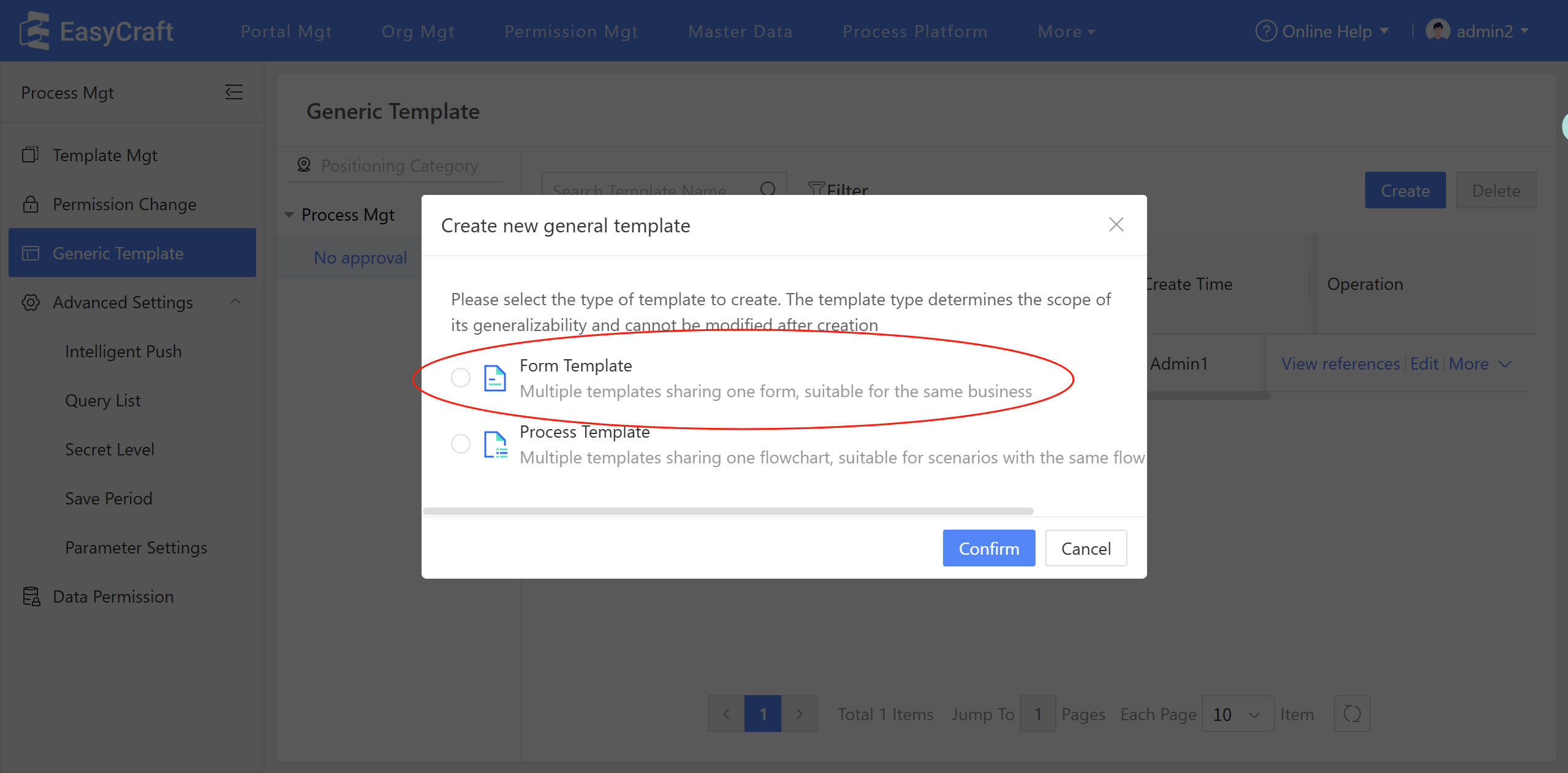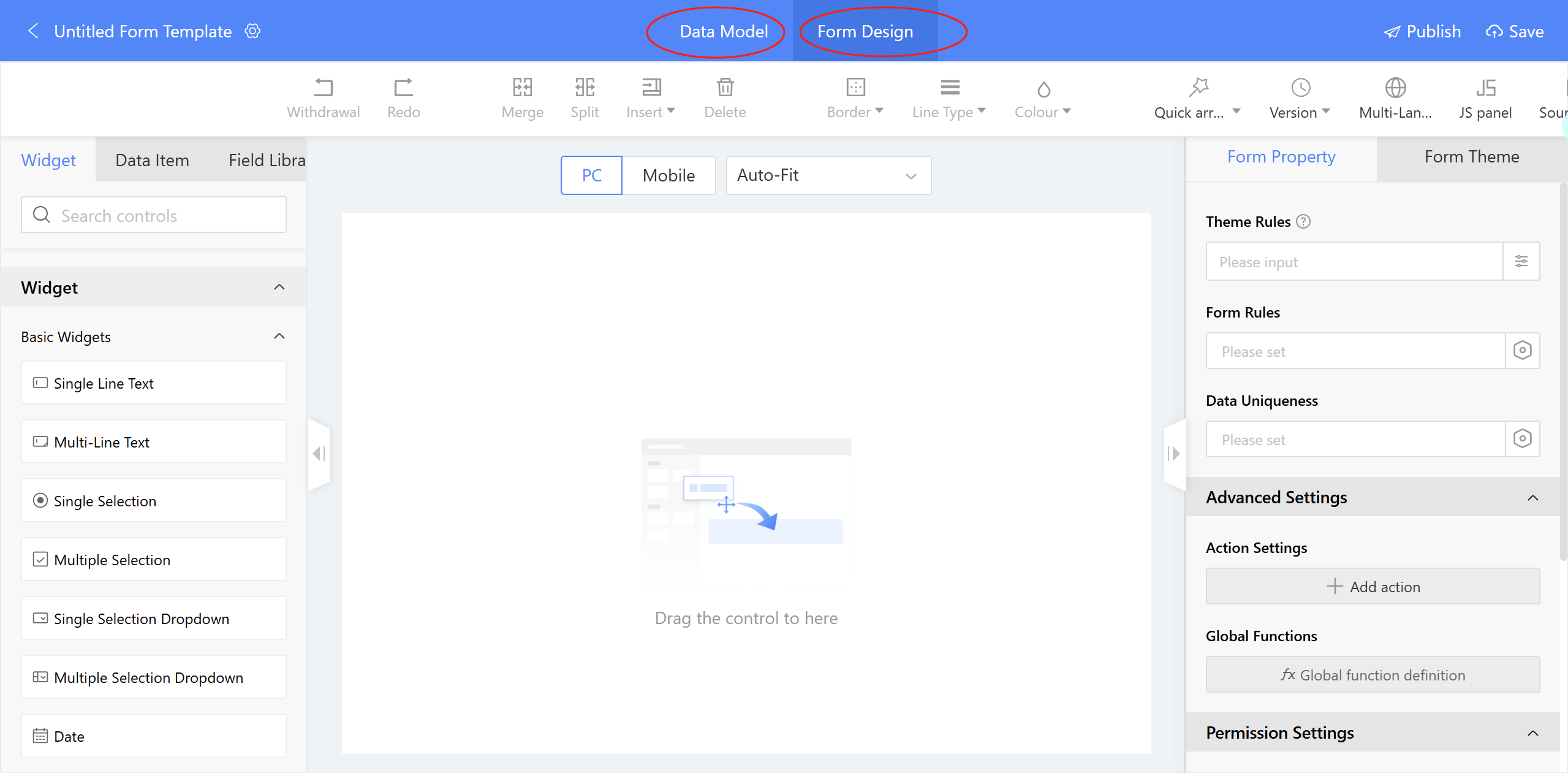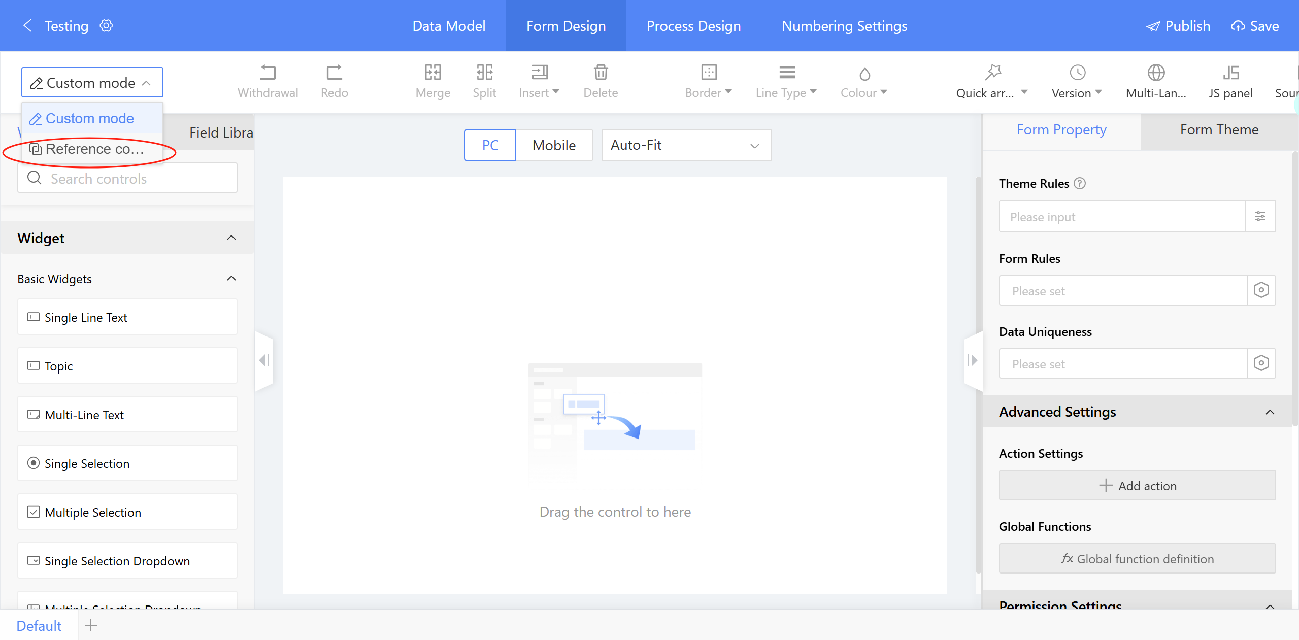 Reference Generic Form Template: The Form Design initially defaults to a custom mode. However, you have the option to switch to "Template Utilization Mode." Please note that this switch is irreversible once the template has been published. Upon attempting to reference a template, a confirmation prompt will appear. If you confirm, any existing custom content within the form will be cleared and cannot be recovered.