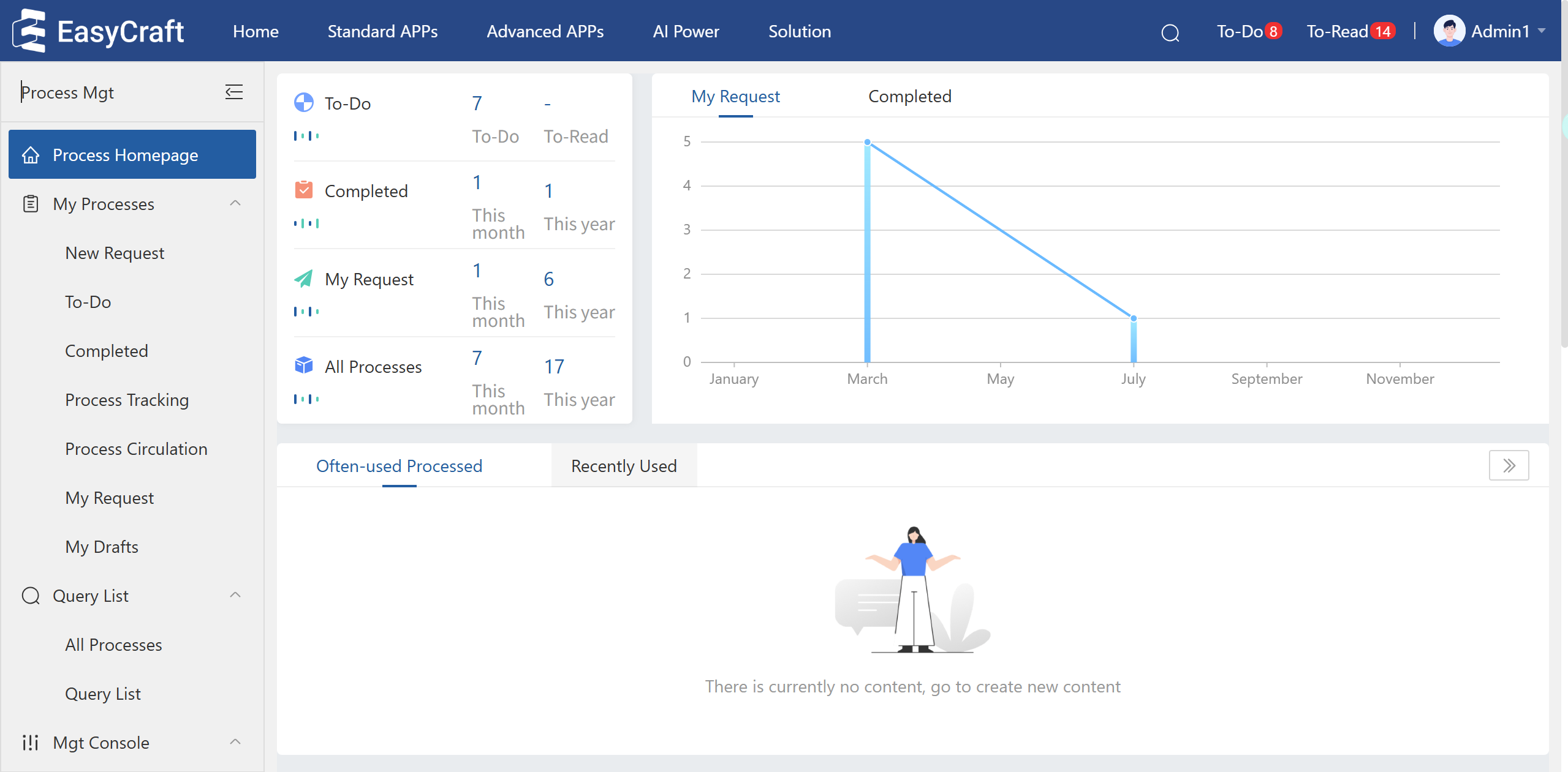 Upon accessing the front end of Process Management, the system defaults to the Process Home page. This page provides a statistical analysis and display of process instances.