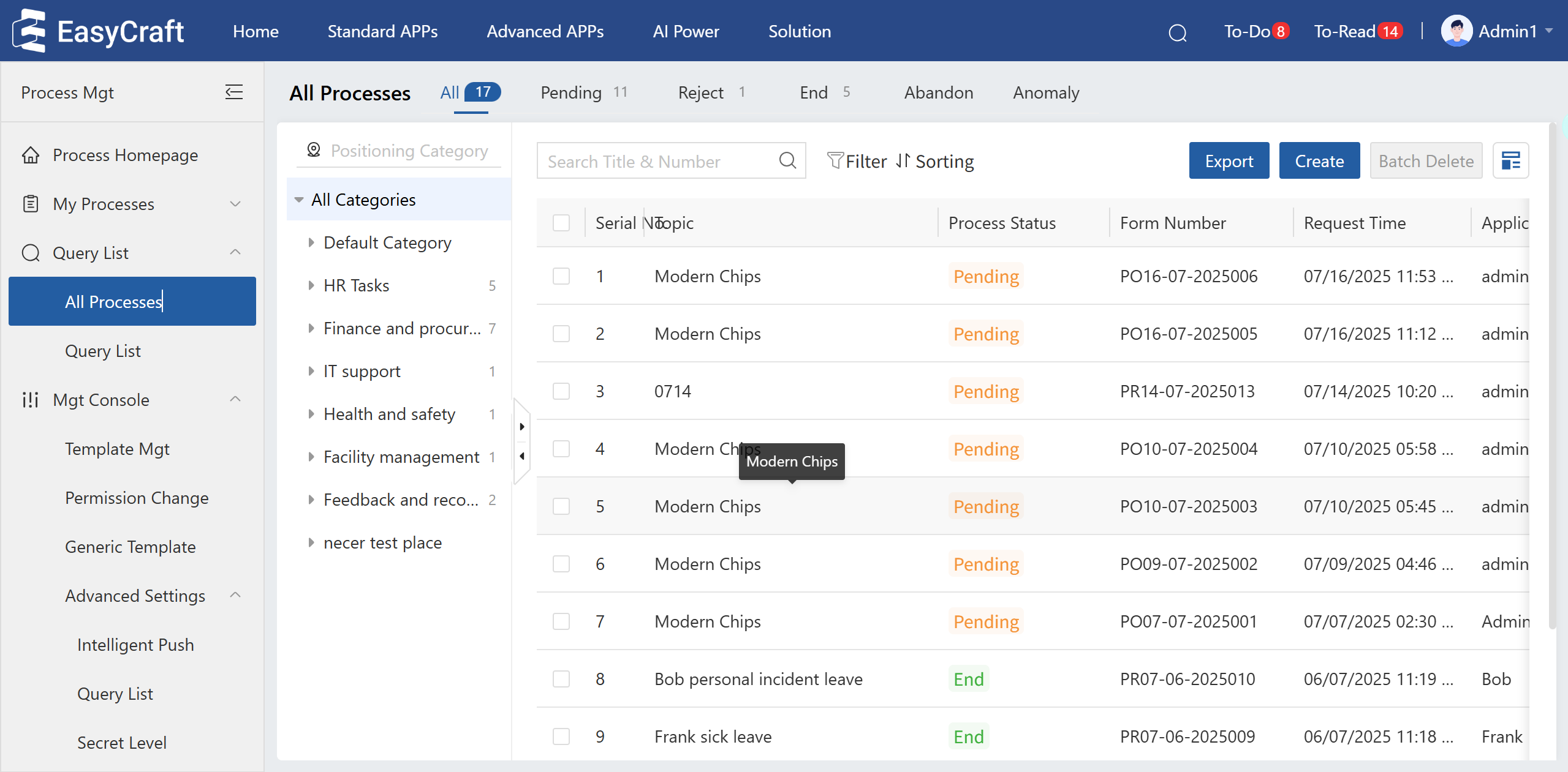 - Supports creating new processes, batch deleting, and exporting process instance information.
