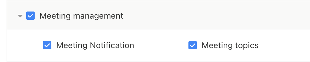 Take Meeting Management as an example, Meeting Management enables Meeting Notification and Meeting Topics. Therefore, the master document of Meeting Management can associate documents of Meeting Notification and Meeting Topics.